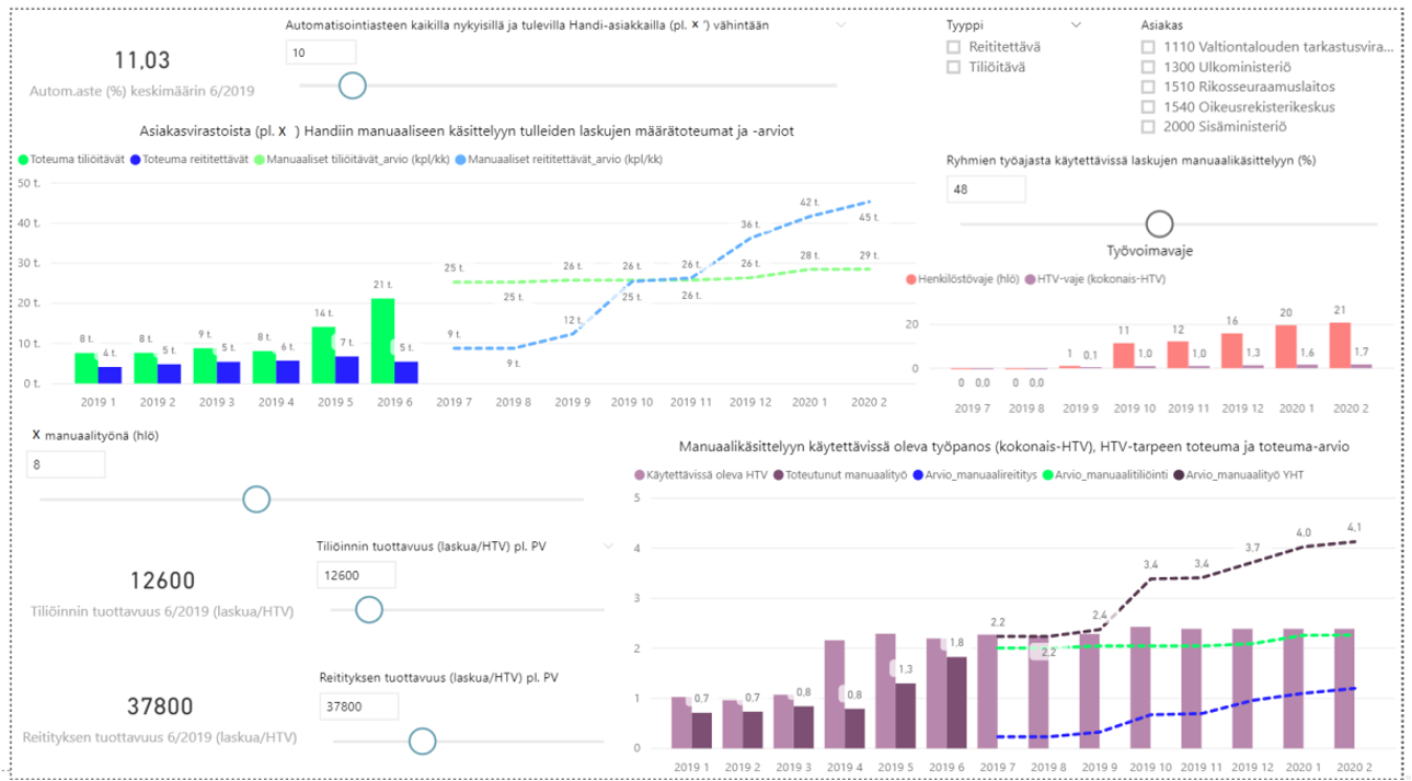 - Henkilöstöresurssien suunnittelun tueksi voidaan toteuttaa vuorovaikutteinen, visualisoitu BI-raportti. BI-raportissa käyttäjä voi määrittää mm. automatisointiasteen, manuaalityön tuottavuuden ja manuaalityön työaikaosuuden haluamalleen tasolle ja tarkastella, millaiseksi henkilöstötarve tällaisissa olosuhteissa muodostuisi.