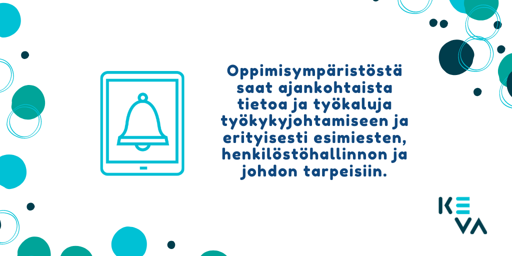 Kevan Oppimisympäristössä tarjoamme ajankohtaista tietoa ja työkaluja työkykyjohtamiseen. Oppimiskokonaisuudet on suunniteltu erityisesti esihenkilöiden, henkilöstöhallinnon ja johdon tarpeisiin. Opit ymmärtämään, mihin asioihin organisaatiossa kannattaa kiinnittää huomiota, kun halutaan tukea ja kehittää henkilöstön työkykyä. Tarjolla on myös käytännön apua ja työkaluja henkilöstön työkyvyn ja työhyvinvoinnin ylläpitämiseen arjessa. Lisäksi saat eväitä esimiesten tukemiseen ja kouluttamiseen omassa organisaatiossasi.