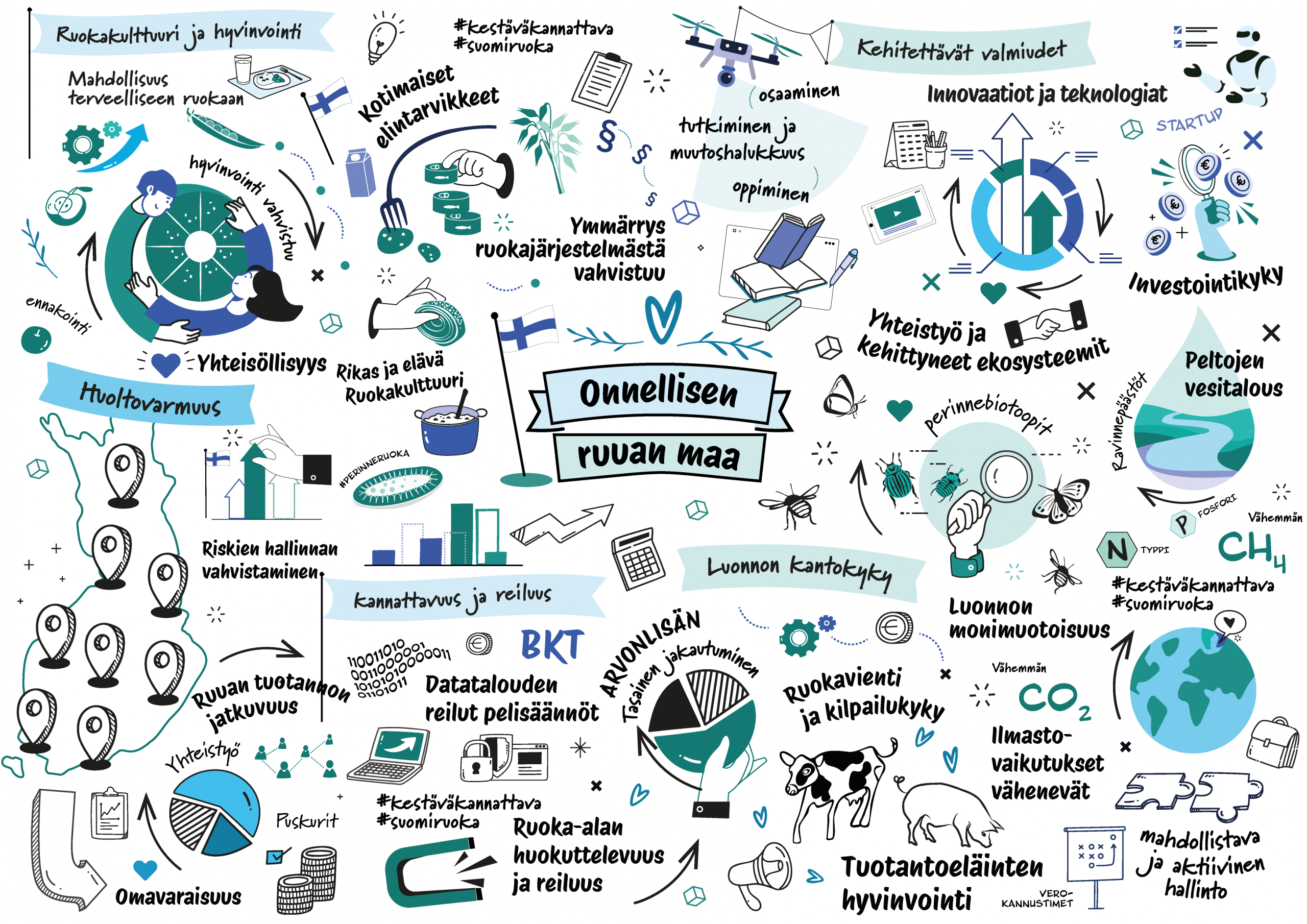 Ruokastrategia on valmisteltu merkittävän laajana sidosryhmäyhteistyönä, tilaisuuksissa yli 600 yrittäjän, kuluttajan, viranomaisen, tutkijan ja järjestön edustajan kanssa eri puolilta Suomea. Lisäksi kaikille avoimeen strategiakyselyyn osallistui yli 3700 vastaajaa. Strategiaa on valmisteltu myös parlamentaarisessa yhteistyössä eduskunnan maa- ja metsätalousvaliokunnan kanssa. Keväällä 2026 strategiasta on tehty eduskunnalle selontekoa ja valmisteltu toimeenpanosuunnitelmaa, josta vastaa perustettava Ruokaneuvosto yhdessä sen osana toimivien teemaryhmien kanssa.