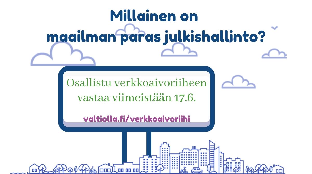 Julkishallinnolle laaditaan parhaillaan yhteistä strategiaa, jota voidaan käyttää ohjenuorana uudistumisessa 2020-luvulla. Hallitusohjelmaan kirjattu tavoite ”Maailman paras julkishallinto” edellyttää julkishallinnolta tavoitteellista yhdessä tekemistä. Samalla se tarkoittaa myös ihmiskeskeisyyttä ja muutoskykyä.