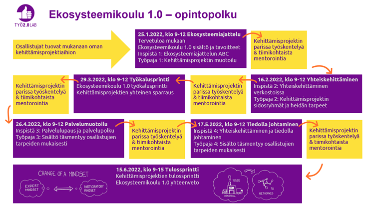 Samalla kerromme Työ2.0Labin ensi vuoden suunnitelmista: Ekosysteemikoulu starttaa heti tammikuussa muutaman ekosysteemin kesken ja työ kiteytetään syksyllä 2022 kaikille avoimen yhteisen oppaan muodossa.